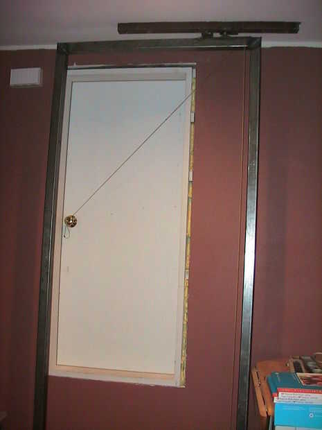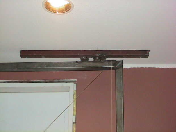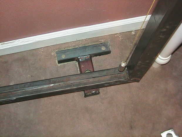 Esto me deja Coloque y el ancla, ancla de base y el marco. Adjunto ancla libremente dejarlo rock, deslizado en marco y anclaje inferior en el pin (con 2 arandelas en pasador de cojinete), luego se deslizó todo el conjunto en su lugar. Una sacudida de ciruela colgando por el borde del marco hecho rápido para saber si estaba vertical en ambas direcciones. Si es cierto sujetar tornillos en ambos extremos. He probado la oscilación del marco de la puerta con ~ 500 libras de gente de pie en ella. Muerto acción.