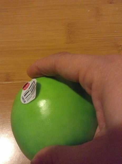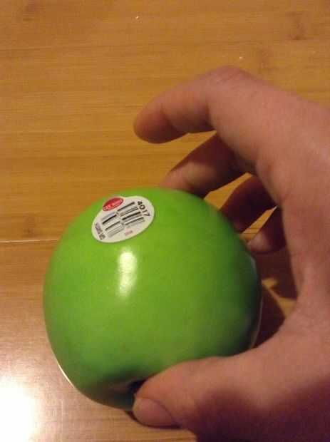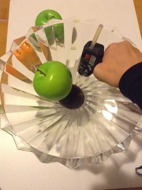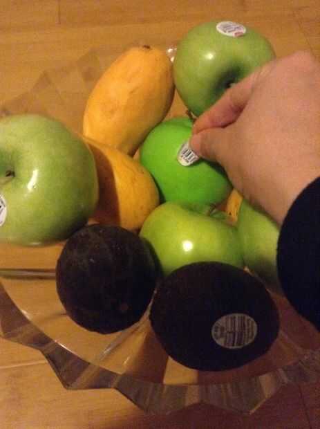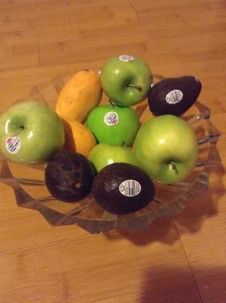 Empezar colocando una pequeña fruta (real) dentro del tazón de fuente. Luego, colocar un pequeño punto de pegamento y colocar la fruta de la falsificación en el pegamento. Incluso puede añadir una etiqueta para hacer la manzana parece más realista. Continuar colocar la fruta real alrededor de la manzana falsa.