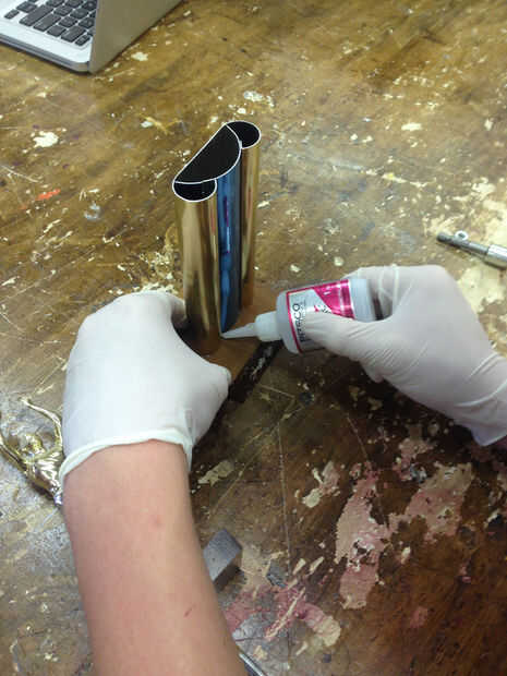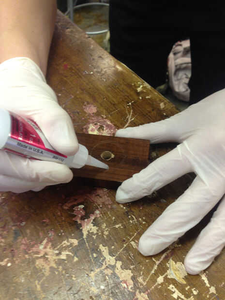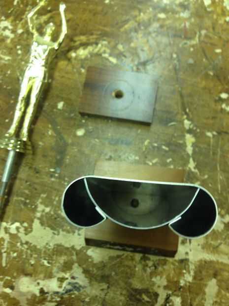 En este paso, pegué la parte inferior y superior pedazos de madera del trofeo en el eje de metal.