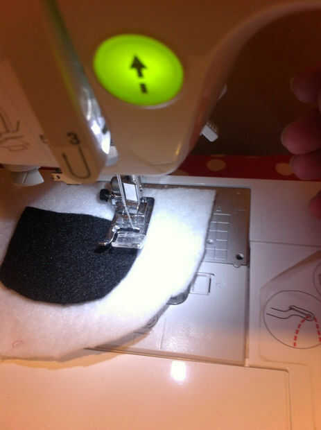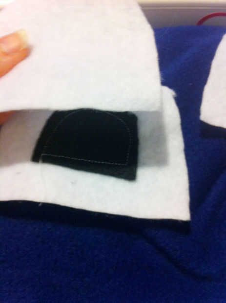 3. Coloque el otro trozo de fieltro blanco encima de la otra pieza. Asegúrese de que la parte negra se enfrenta en y coser alrededor del borde curvado. Dejando el borde recto. Luego gire derecha hacia fuera. Ponga a un lado por ahora.