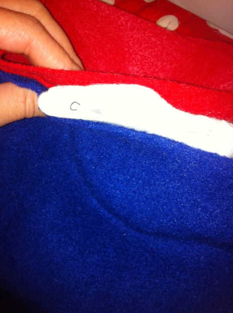 2. una vez que usted tiene hacer todo que es el momento de poner todo junto. Coloque la boquilla dentro del cuerpo azul con el parece frente a la misma dirección. Los ojos entre la parte de boca y cuerpo para que mires como esta capas del emparedado. La parte negra del ojo debe estar tocando la parte de la boca roja. La colocación del ojo es hasta que decidí poner minas juntas en el centro.