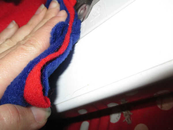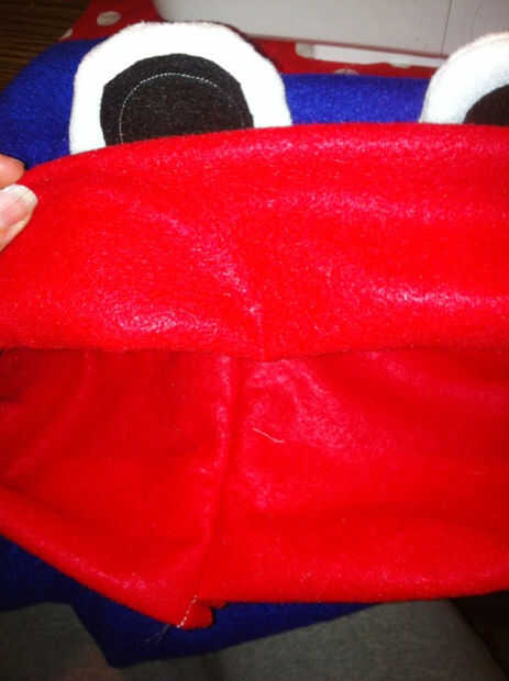 1. Desenroscar la su derecha del proyecto. Usted notará que la boca parezca está hacia fuera en la parte inferior. Eso es porque vamos a doble sobre. Doblar el extremo de la boca hacia los ojos. Coser todo alrededor.