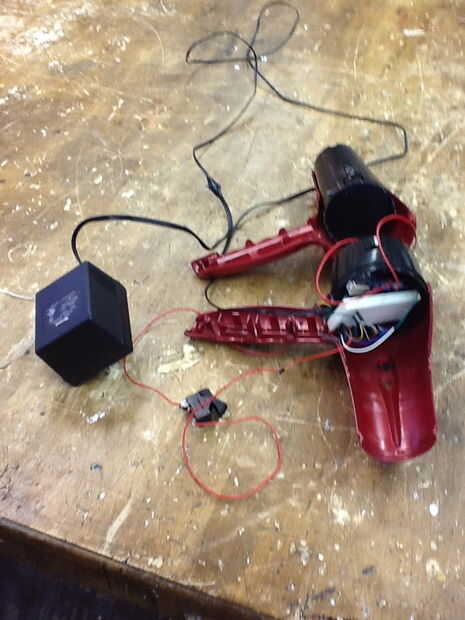 se trata de una serie de experimentos con un motor de 12 voltios de un secador de pelo. El secador es 220 voltios, pero en lugar de utilizar un transformador utiliza la resistencia térmica en serie para reducir el voltaje a 12 voltios y algunos diodo
