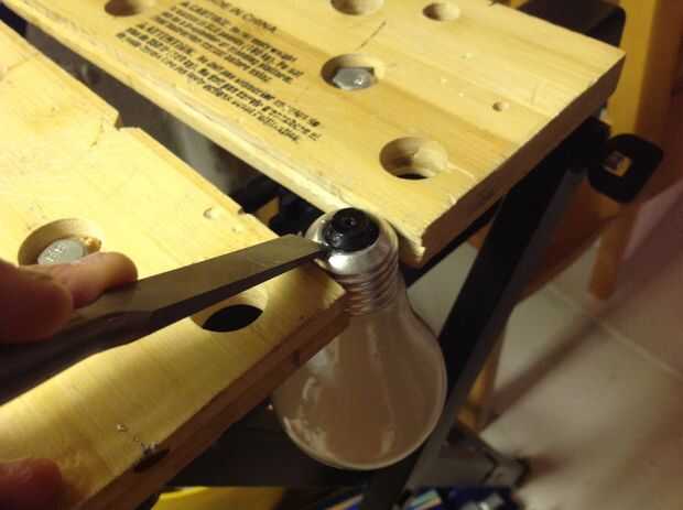 Agarra un destornillador o un formón pequeño (yo usé ambos) y un martillo y haga palanca suavemente desde abajo el anillo de cerámica negro. No te preocupes el anillo, puede ser dañado. Preocuparse de las roscas en la base de metal. Una vez que tenga un pequeño espacio entre la parte inferior del anillo negro y el metal abajo, tienen como objetivo el destornillador hacia arriba en el espacio y golpear con un martillo. Debe ser pulsado hacia arriba para hacer que el aro metálico a chip off y volar hacia arriba. Si tratas de golpear hacia abajo, la prensa sólo mantendrá absorbiendo el impacto hasta que se acercaba lentamente la bombilla hacia abajo y hacia fuera de la prensa.