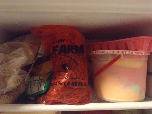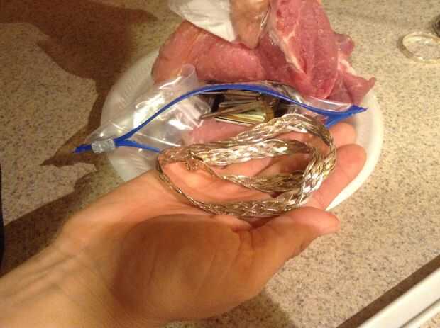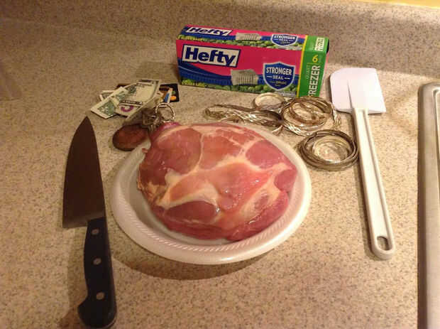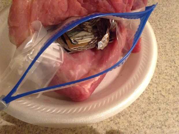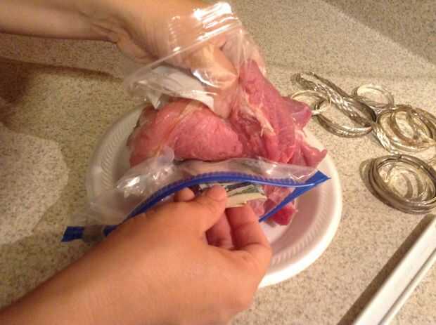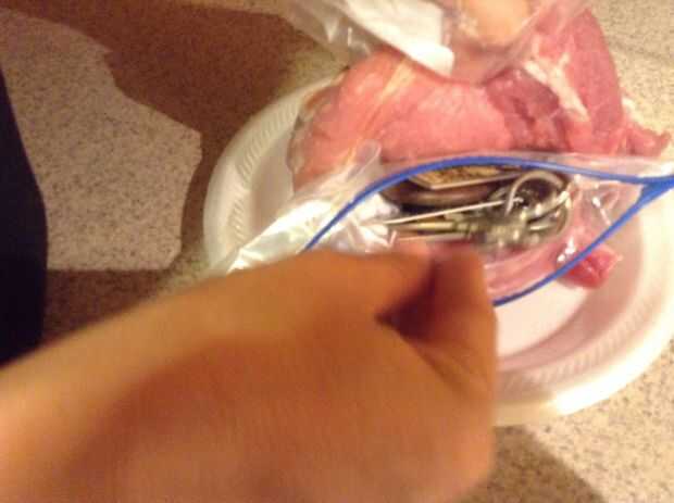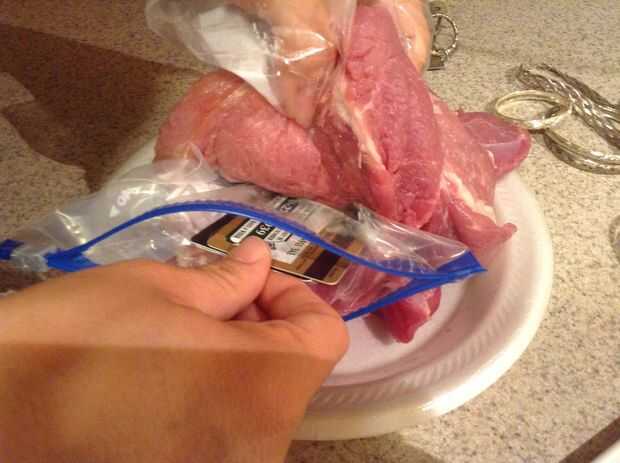 Tomar la carne entera y colóquelo en una bolsa Ziploc de congelador y colocarlo en el congelador como lo haría normalmente. Ahora sus pertenencias están aseguradas en su propia fortaleza de carne cubierto de soledad.