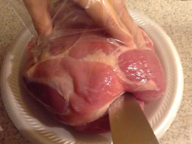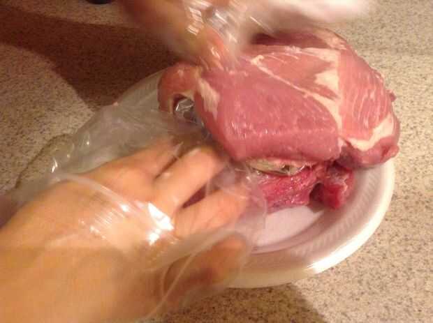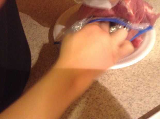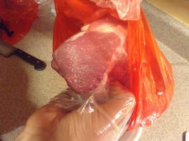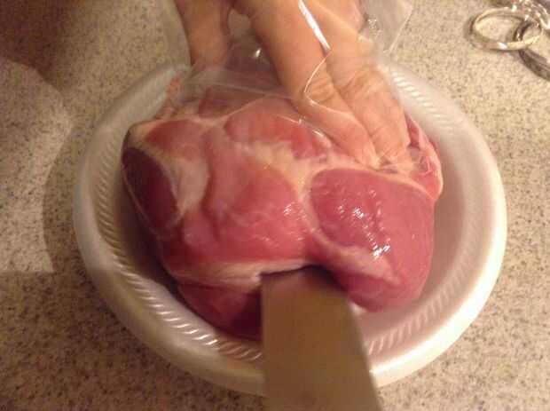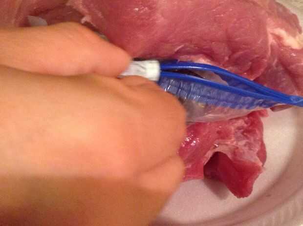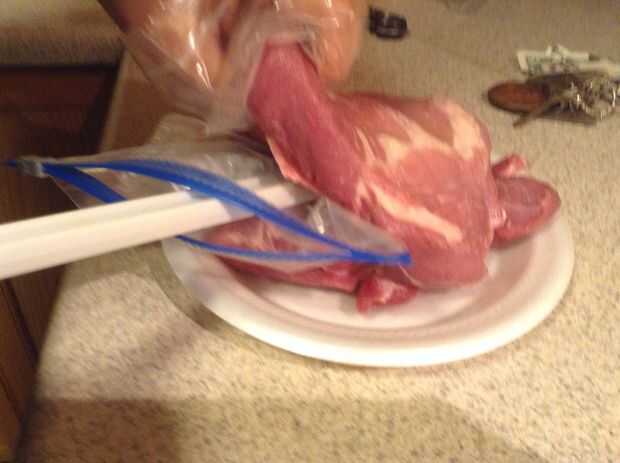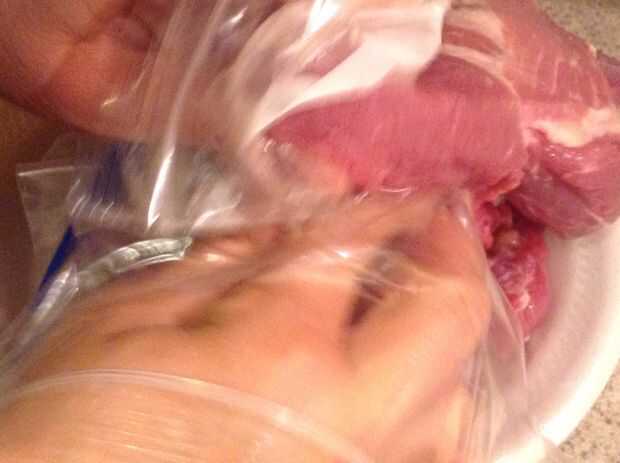 Ponga el extremo del mango de la espátula en la bolsa de Ziploc hasta que quede en la parte inferior de la bolsa. Con la espátula en la bolsa, utilice la espátula para empujar la parte inferior de la bolsa en el corte que previamente hecho en la carne. Sacar la espátula y moverse para seguir empujando la carne en el resto de la parte inferior de la bolsa. Continúe hasta que sólo la abertura de la bolsa sin sellar superior es visible fuera de la carne.