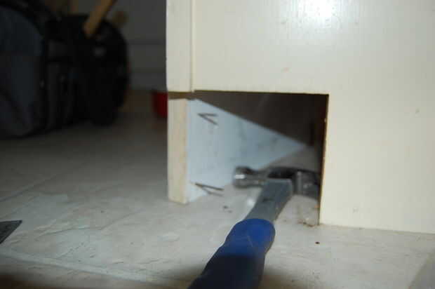 Entonces empezar a empujar la tabla hacia adelante y hacia atrás con la mano, teniendo cuidado de no romper o crackearlo. Esto puede tomar un tiempo si el espacio es apretado, asi que tengan paciencia. Está bien doblar los clavos, y una vez lo suficientemente lejos hacia fuera, puede explosión en él con el martillo.