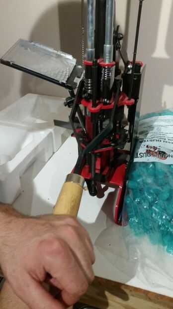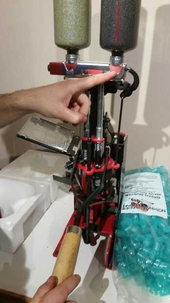 Oprima la manija hasta que se completo la posición hacia abajo. En la carrera hacia abajo la máquina se pulsa en una cartilla nueva. En la carrera ascendente la máquina dejará caer una carga de polvo medido en la ronda. Verifique la barra de carga ha movido posiciones sobre la terminación de la carrera ascendente. Indexará el caso a la siguiente estación, y ahora tendrá una ronda que tiene una cartilla nueva y polvo en él.