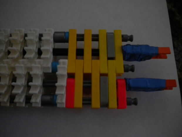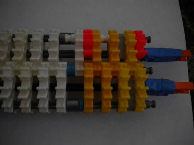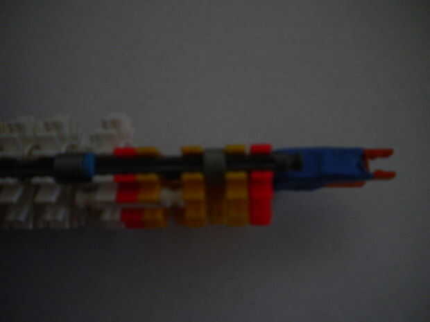 Hola, este es mi K'nex escopeta, dispara balas de por lo menos 2 al mismo tiempo y tiene mucho poder. He intentado hacer la pistola más sólido de su forma original mediante el refuerzo de las piezas alrededor del gatillo con conectores escalera naran