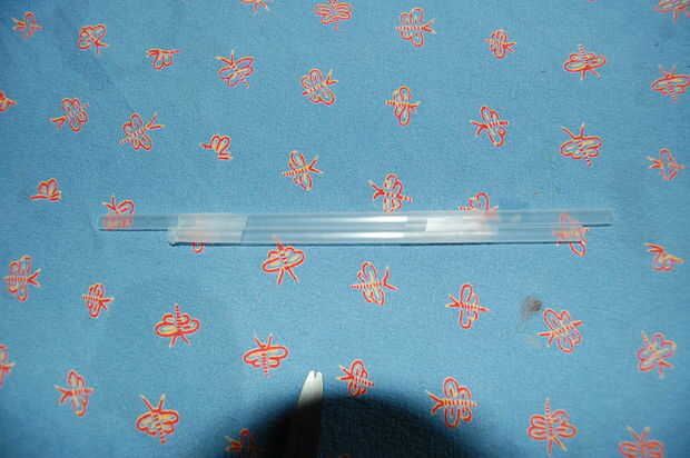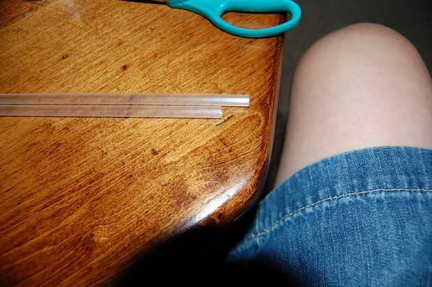 tomar una cañita take aproximadamente una octava parte de una paja y cinta que en paja completo 1 Asegúrese de que la paja superior se sobresale un poco en un extremo y más en el otro. como se muestra a continuación.