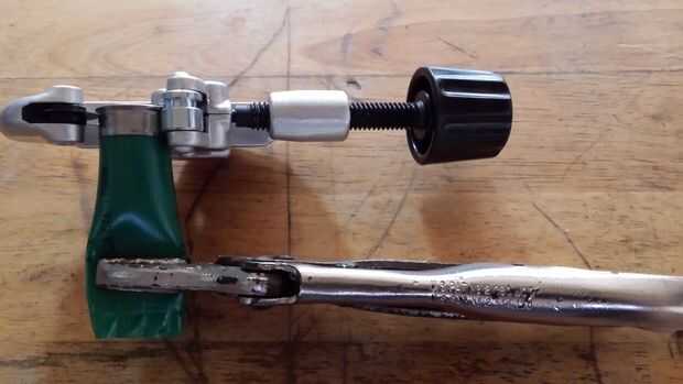 Poner shell usado en el cortador de tubos con el cabezal en las ranuras de la parte inferior y apriete cortador hasta que la rueda de corte es justo detrás de la cabeza. Sólo apriete cómodamente y no apretado. Desea que el cortador de tubos a sostener la cáscara firmemente en este punto.