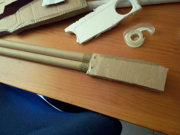 Para el cañón y la guía de la corredera usaremos sendos tubos de cartón, uniremos al cuerpo mediante tornillos para darle mayor estabilidad. Ambos tubos irán unidos con tornillo de las Naciones Unidas, tal como se ve en la imagen. Después taparemos ese montaje. Para añidir el gatillo recortaremos un par de trozos de cartón y los pegaremos.
