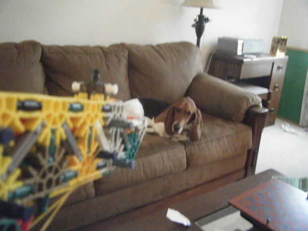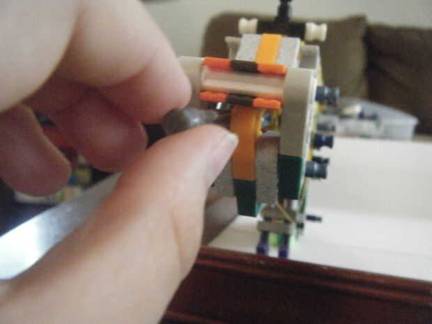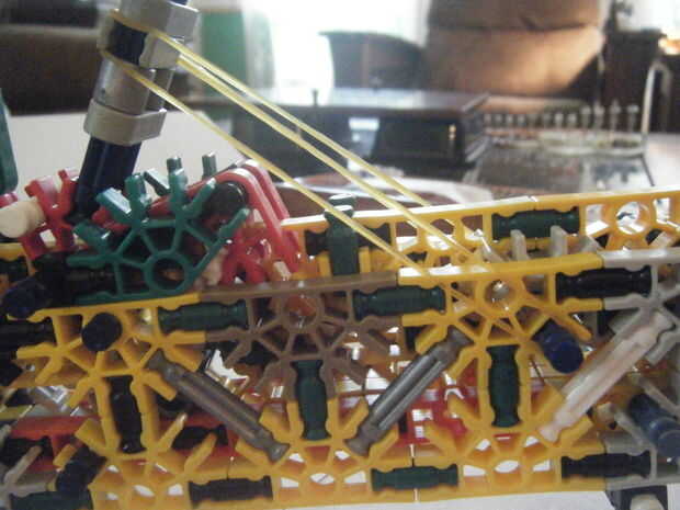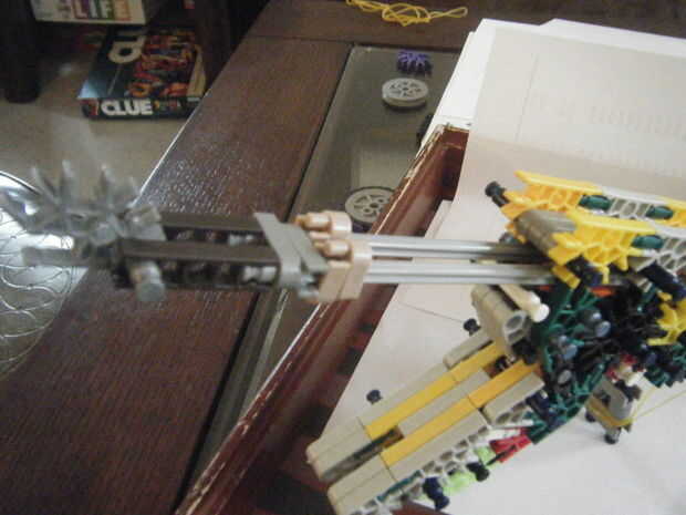 Hola, este es mi K'nex escopeta, dispara balas de por lo menos 2 al mismo tiempo y tiene mucho poder. He intentado hacer la pistola más sólido de su forma original mediante el refuerzo de las piezas alrededor del gatillo con conectores escalera naran