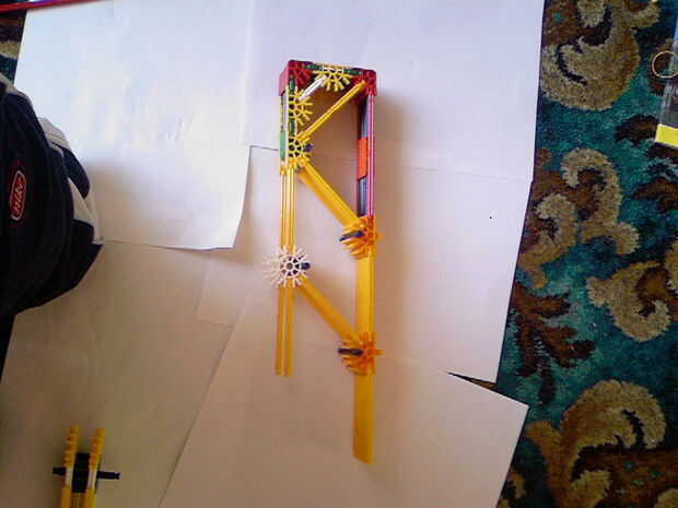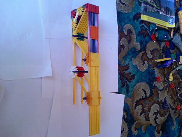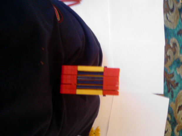 Conectores de toma 6 amarillo y clip en la parte inferior con una barra azul luego agregar barras de amarillo 6 en ambas direcciones, clip un conjunto del asidero. Tomar 6 conectores más amarillos y clip de ellos junto con una barra azul Conecte los conectores sobre las otras varillas amarillas 6, agregar 4 barras azules en el medio y agregar 2 barras rojas en los extremos, conectores naranja a las barras azul y añadir 4 más barras azules a los conectores, seis conectores rojo al rojo y azul barras luego añadir 4 barras azul vertical y 6 varillas amarillas diagonalmente. Añadir conectores rojo a las barras azul y añadir un conector amarillo a ambos lados de las barras azul conectado con barras verdes hacer lo mismo en el otro lado de los conectores y conectar los 2 conectores amarillo con barras blancas luego añadir 4 conectores verdes y al amarillo de los conectores a las barras amarillas que he mencionado anteriormente entonces conectar a las barras azules. Obtén 4 conectores rojo y 2 conectores de copo de nieve y conecte a los conectores amarillo mediante barras amarillo, a continuación conecte los copos de nieve a la manija por barras amarillas.