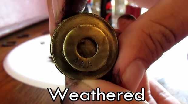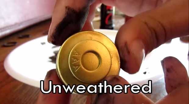 Siguiente tomar el zapato polaco y comenzar a aplicar a los lados y la parte inferior de los cuerpos (Fig. 1). La misma técnica se utiliza en los casquillos, con especial atención a las letras estampadas en las tapas de las arandelas (Fig. 2). Esto crea la apariencia de suciedad/aceite/suciedad en los pequeños detalles de las cáscaras. Utilicé una mezcla de Q-tips, tejido y mis manos para aplicar el pulimento. Esta técnica va sobre todo por la sensación, tan solo experimento para ver lo que funciona mejor para usted :)