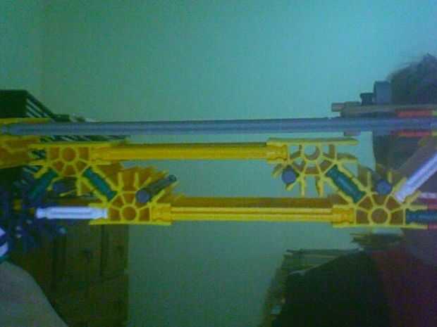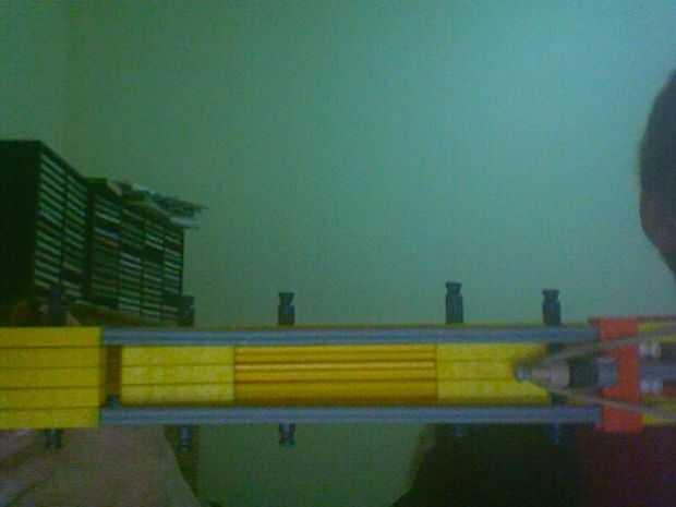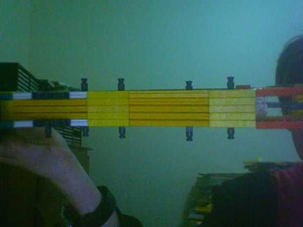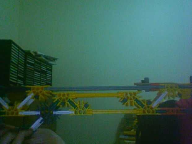 Hola, este es mi K'nex escopeta, dispara balas de por lo menos 2 al mismo tiempo y tiene mucho poder. He intentado hacer la pistola más sólido de su forma original mediante el refuerzo de las piezas alrededor del gatillo con conectores escalera naran