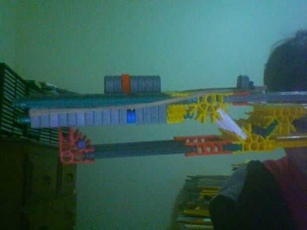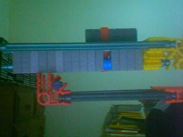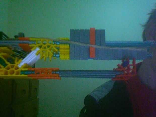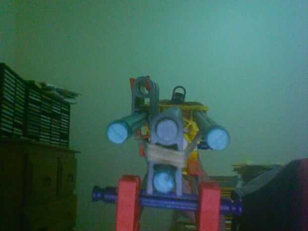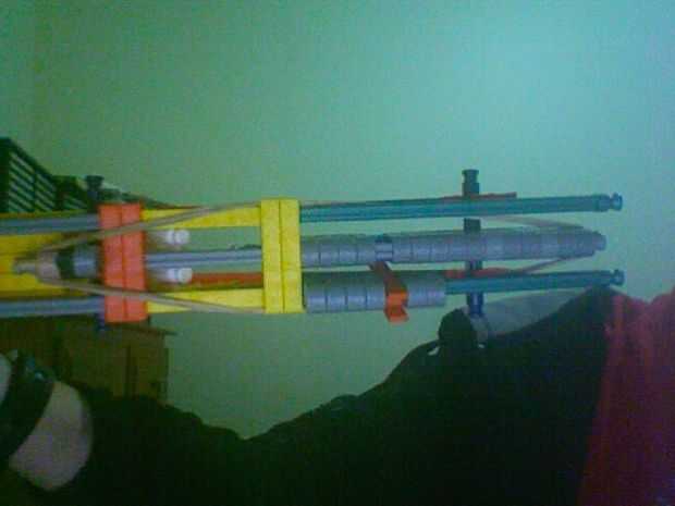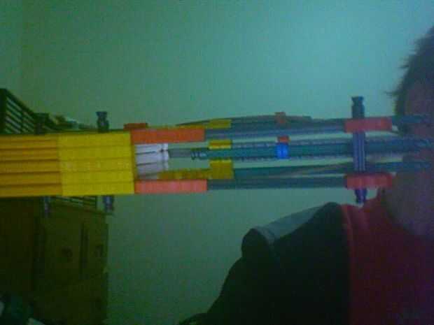 Hola, este es mi K'nex escopeta, dispara balas de por lo menos 2 al mismo tiempo y tiene mucho poder. He intentado hacer la pistola más sólido de su forma original mediante el refuerzo de las piezas alrededor del gatillo con conectores escalera naran