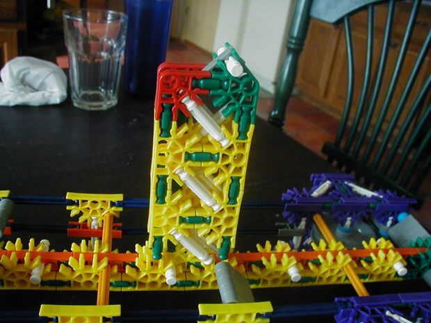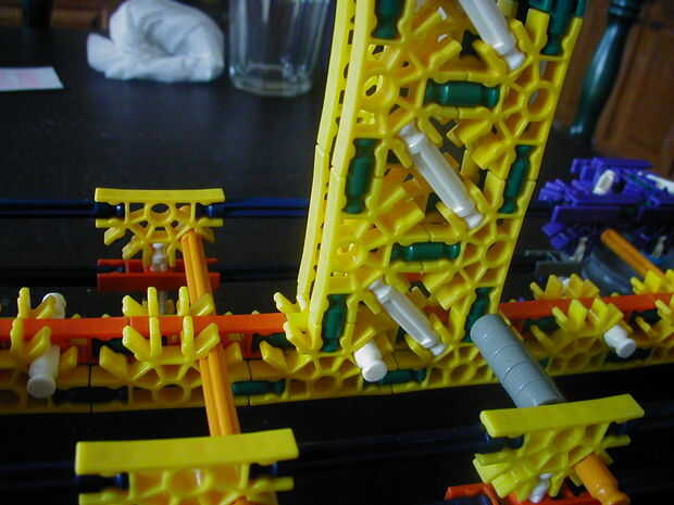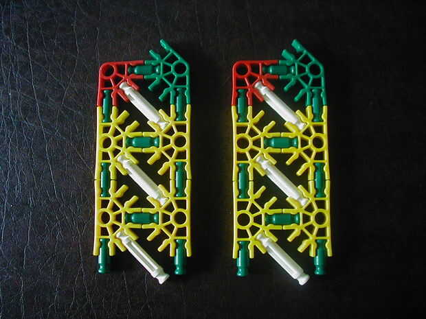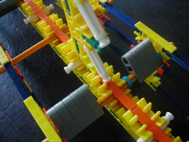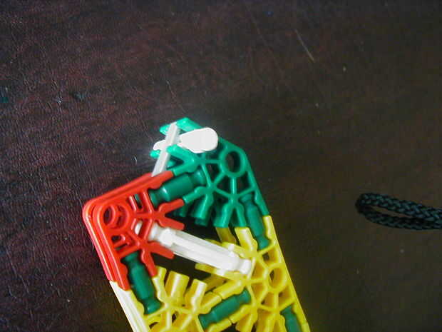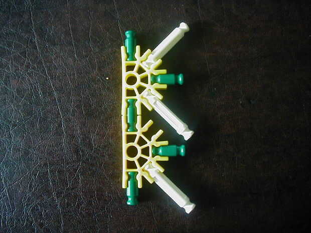 8: Separe los lados de la empuñadura ligeramente así que usted puede adjuntar sus barras verdes y blancas a conectores amarillos de la pista inferior