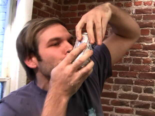 Aumentar el agujero que acaba de hacer con el dedo a la boca, pop la parte superior de la lata como lo haría normalmente escopeta una cerveza y trago a la cerveza que fluye dentro de la boca tan rápida como puedas.