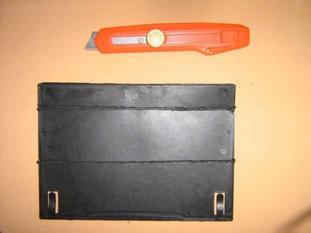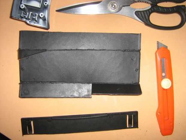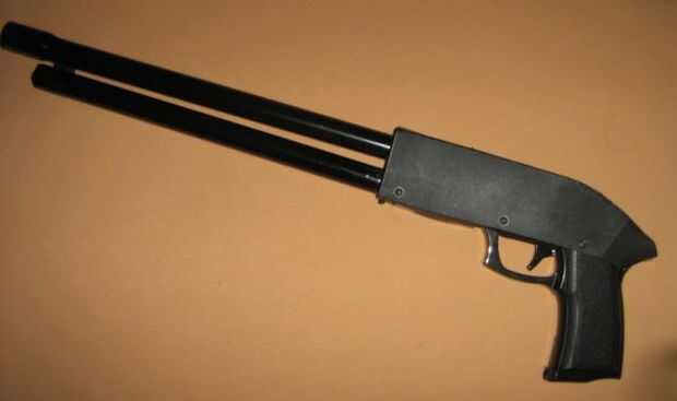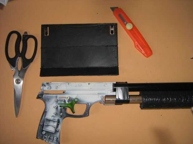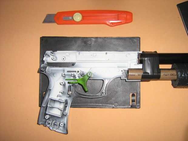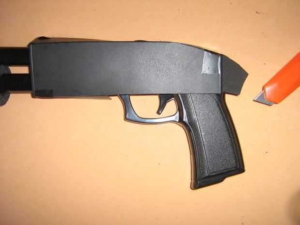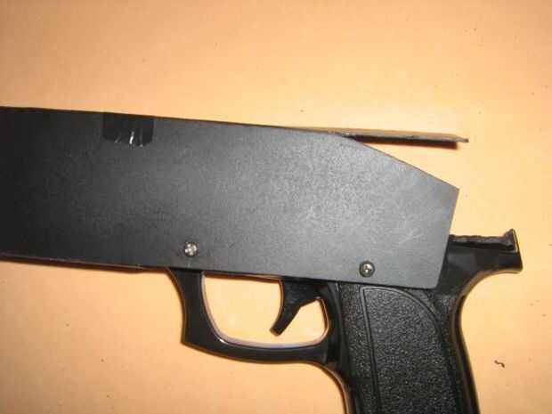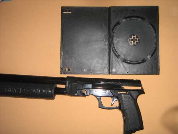 Corte y doblar una caja de DVD para cubierta de cañón de la pistola y buscar como un cuerpo real de la escopeta. Marcar y doblar el caso como se muestra. Cortar las piezas como se indica. Caso a pistola, fijar con tornillos.