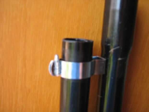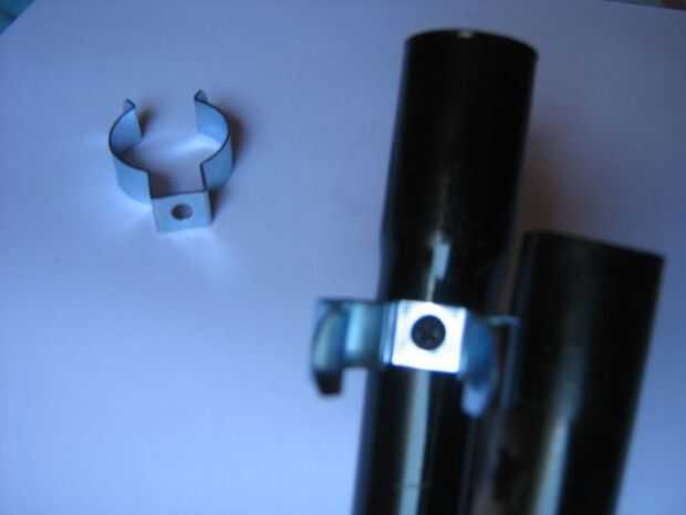 Fijar un clip de lámpara fluorescente en el barril (uso tornillo pequeño). Abrazadera para varilla de la bomba y fijarlo con un DIY-acero-alambre de cierre. Usé una tuerca de rack (ver foto) como vista de hierro. Pintar en negro (dos capas delgadas).