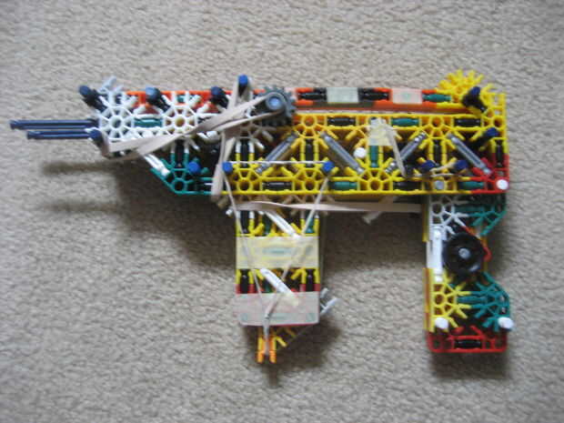 esto un moderno tomar una de mis armas favoritas que he hecho. Si crees que es una pistola percutor genérico, luego no se vaya todavía. Esto utiliza un pin único. Básicamente, todo lo que es es una barra azul que sobresale entre un riel inferior y superior con los engranajes que lo mantenga cualquiera de los extremos. Esto puede hacer un arma muy compacta y de mejor aspecto