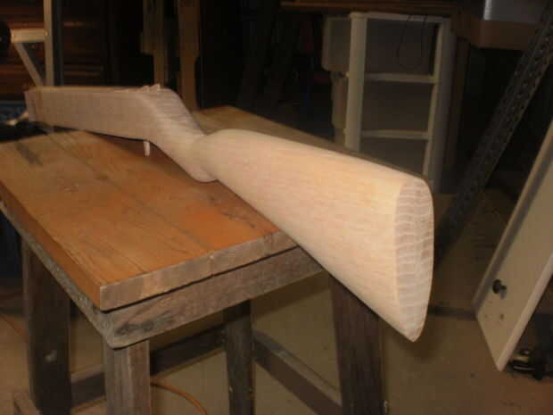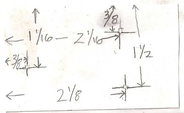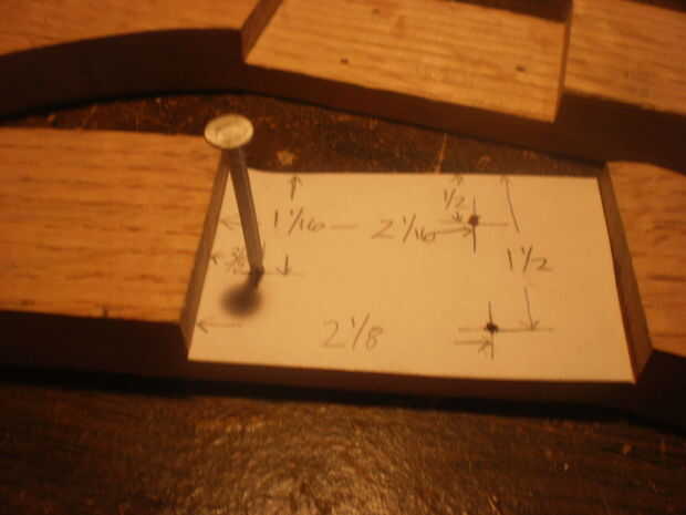 Ver fotos 1-3 para la correcta colocación de los pernos de montaje. En primer lugar, el sacador un clavo en la madera en los lugares marcados un poco para utilizar como una guía para el taladro. Esto evitará que bailar alrededor de la superficie. También se podría utilizar un punzón si tienes uno. Perfore agujeros en la culata en los lugares marcados, estar absolutamente seguro de que los orificios de cada lado están alineados idénticamente y perforar sólo lo suficiente en la madera para sujetar los pasadores en su lugar.