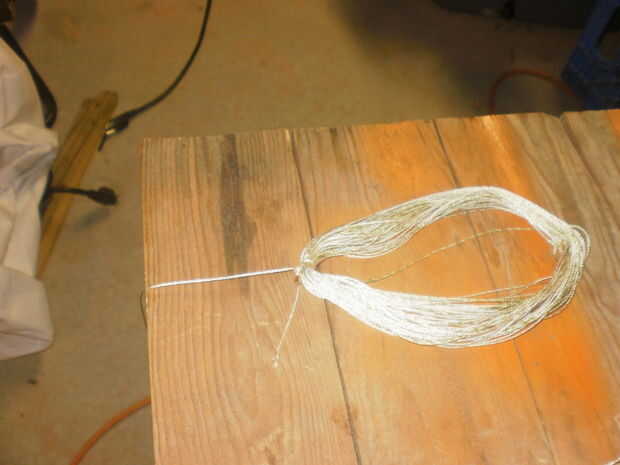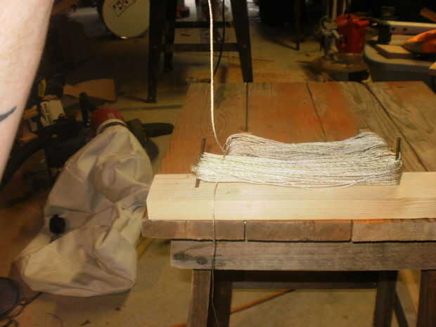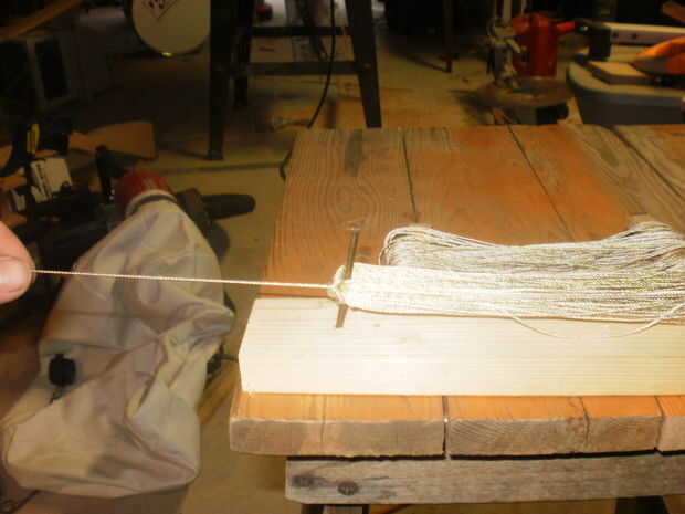 Mantiene todos los filamentos juntos, envolver la longitud alrededor de la plantilla tantas vueltas completas como sea posible. Tienes unas pulgadas sobrantes después de la última rotación. Corte este extra. Usar una cadena como la cadena de subprocesos. Ver fotos 2 y 3. Pase la cadena enhebrada a través de todas las capas de cuerdas en un clavo y atar firmemente. Esto asegurará que sus filamentos primavera permanecen juntos y harán de roscar la primavera a través de los agujeros en el marco mucho más simple.