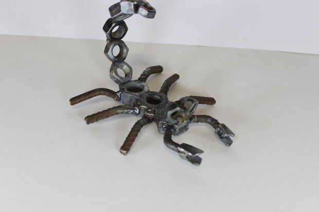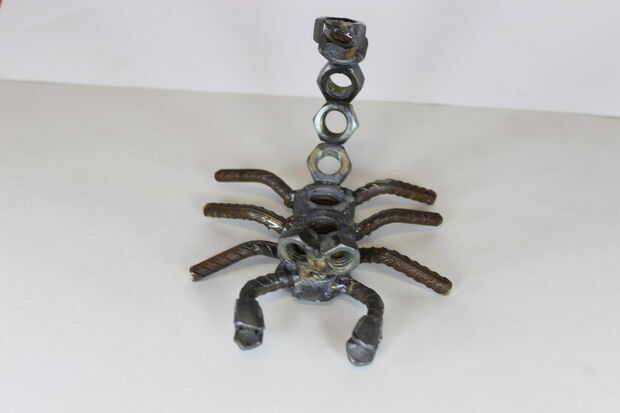 Una escultura de metal de desecho de un tio tocando la batería. todo está soldado a una 5 "X 5" pedazo de 1/4 lamina plana de metal. terminar con una capa transparente de la pintura!