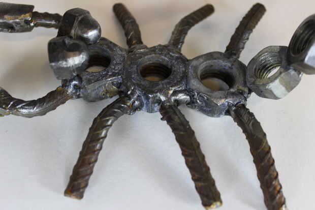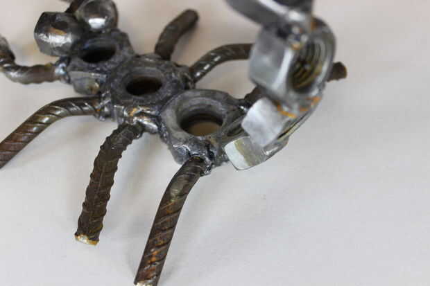 Una escultura de metal de desecho de un tio tocando la batería. todo está soldado a una 5 "X 5" pedazo de 1/4 lamina plana de metal. terminar con una capa transparente de la pintura!