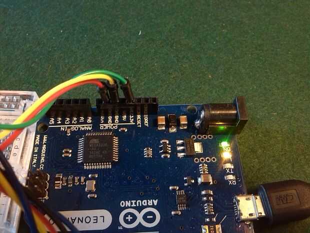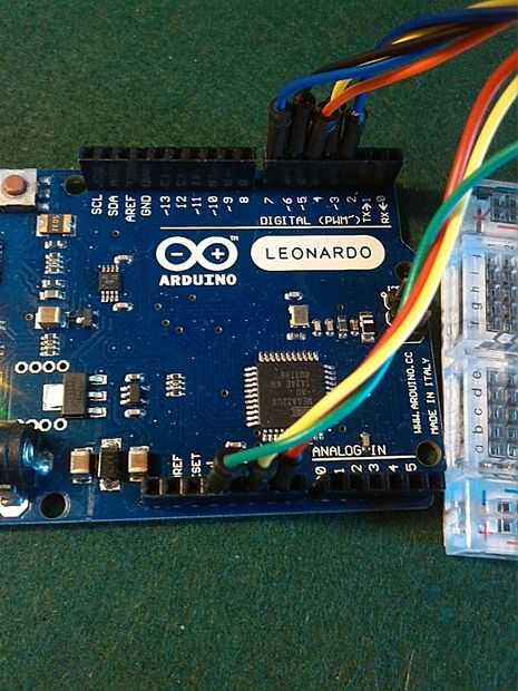Así que los últimos 3 cables va a 3,3 v, GND y GND en la sección de alimentación del Arduino Leonardo los primeros 5 cables va a la sección digital en orden a los pins: 3,4,5,6 y 7.
