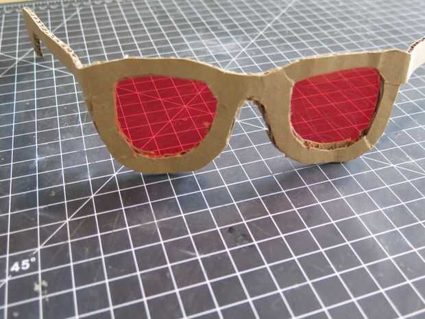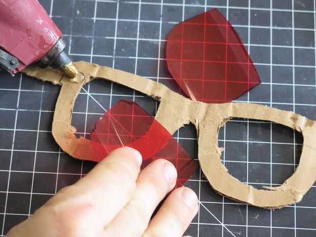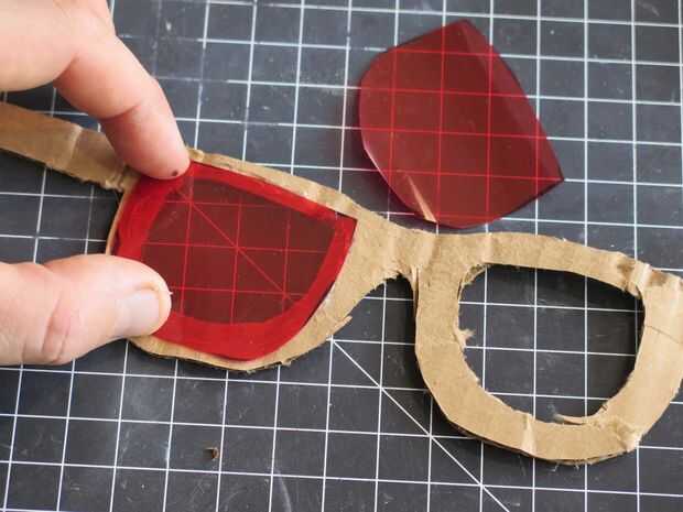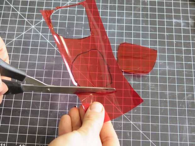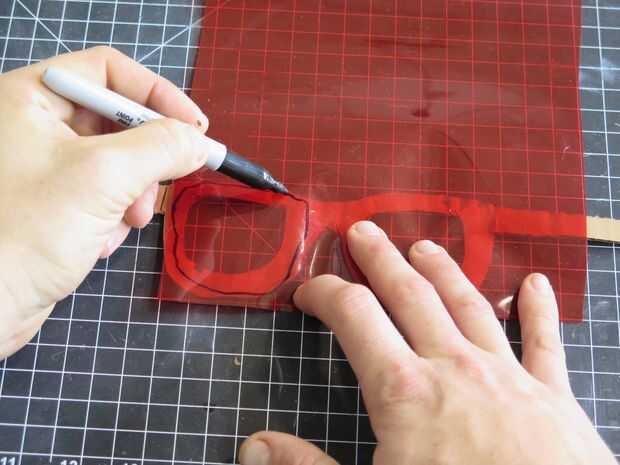 Tome el pedazo de acetato rojo y trazar el tamaño de sus lentes contra sus marcos. Asegúrese de que hacer más grande que el agujero, para que tenga espacio para pegamento caliente. Después de fijar ellos, deje que ellos seco durante un segundo, y tiene un nuevo par de tanques de descodificación.