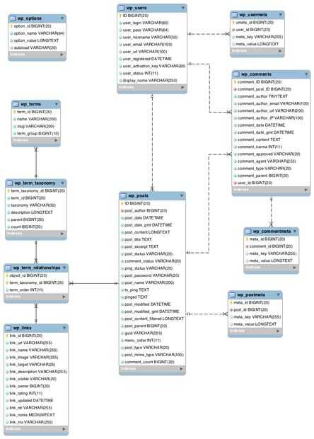 Las imágenes de arriba son el diagrama de base de datos de WordPress desde el WordPress Codex.