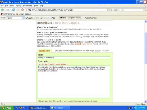Cuando haya terminado con la descripción del Instructable, haga clic en el botón en la parte inferior de la página que dice guardar y primer paso. Los pasos de la escritura es el mismo procedimiento. Cada página de paso requiere un título y una descripción. Puede añadir imágenes a sus pasos, también.