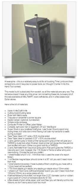 Como autor de Instructables, esto puede ser el paso más difícil para realmente disfruto, pero como lector de Instructables, este paso es siempre preciosos para mí. Dar el lector una idea clara de lo que él o ella está consiguiendo en es importante porque Afrontémoslo: estamos trabajando dentro de un presupuesto. Por lo que si veo tu foto de portada y creo que su modelo a escala de la Tardis de Doctor Who es una gran idea, pero no saber hasta que estoy en medio de ella que se necesita un kit Arduino de $150 para correr las luces y el sonido, voy a ser muy decepcionado.