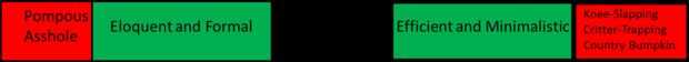 La zona negra en el centro representa discurso informal, o palabras a raw. Sin embargo al tratar de traducir los pensamientos en la escritura profesional, es común terminar desviándose demasiado lejos de cualquier extremo del espectro, tratar de sonido demasiado "inteligente", o también puede ser confuso o informal con un lenguaje más sencillo.