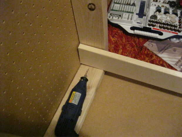 Asegúrese de que las piernas que están a punto de añadir pie hacia arriba y hacia abajo (uso un nivel si es necesario) antes de atornillar a los soportes. Usted debe tener cuatro patas y la pegboard y el todo el apoyo-trabajo en su lugar ahora.