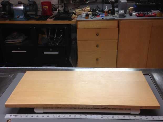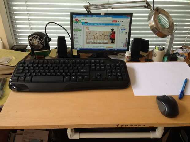 Hice mi tablero del escritorio al ser más ancha que mi silla y profundidad suficiente para proporcionar una superficie de escritorio para un teclado inalámbrico, mouse y algún papel. Le sugiero que párese detrás de su silla en su escritorio e imagina el tamaño que sea más cómodo. Lo que es demasiado grande podría hacer que más inestable en el respaldo de la silla. Demasiado pequeño y, bueno, todo el mundo le gusta un gran escritorio. (Puede esperar a decidir sobre el tamaño de la mesa final hasta después de colocar el PVC y simplemente cortar un tablero del escritorio más grande para empezar). Corté mi escritorio 28 x 13.5 pulgadas.