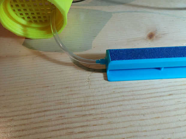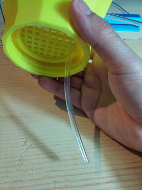 1. Tome el extremo de la tubería de aire y pase por el agujero pequeño en el lado de la tapa. Será un ajuste apretado que tal vez necesite usar unos alicates de punta para ayudar a la alimentación/extracción lo a través de. Aproximadamente 5-6 pulgadas a través de la alimentación.