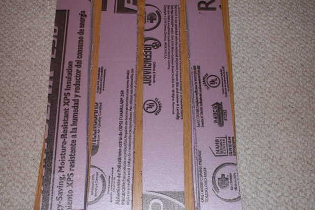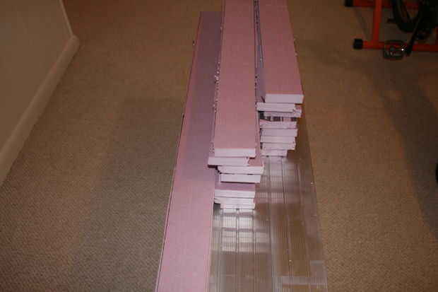 Para construir los soportes para el escritorio, cortó mucho la espuma en tiras de 2 pulgadas. Realmente no planeo mi construcción así que hice unos tamaños diferentes.