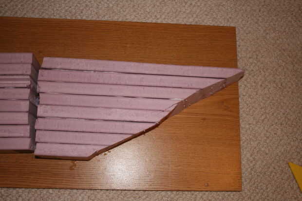 Mientras que es fácil cortar la espuma en tiras, corte en los apoyos es sorprendentemente difícil. Usted puede cortar a través de la espuma de 1/2 pulgada con una cuchilla con sólo un poco de esfuerzo, concentración sobre todo para asegurarse de que usted vaya en línea recta.