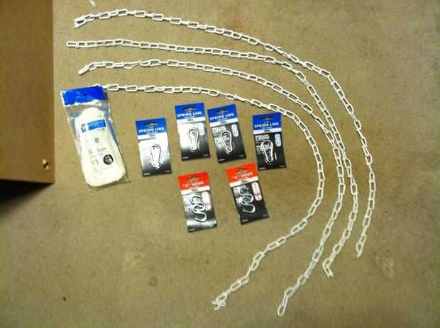 -Cuatro secciones de cadena de 4 pies de largo. Prefiero cadena Tenso, debido a su diseño de doble circuito de enlace, es realmente fuerte. También es super barato. Lo que obtener, asegúrese es nominal de por lo menos 150 libras (Tenso que compré tiene una potencia de 244).