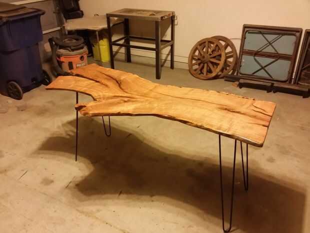 Este impresionante aspecto vivo borde mesa se realiza mediante una losa de madera y algunos barra acero que doblado en forma plana, soldadura no involucrados. Hay así que muchos fresco mirando las losas que hay para escoger en diferentes colores, tam