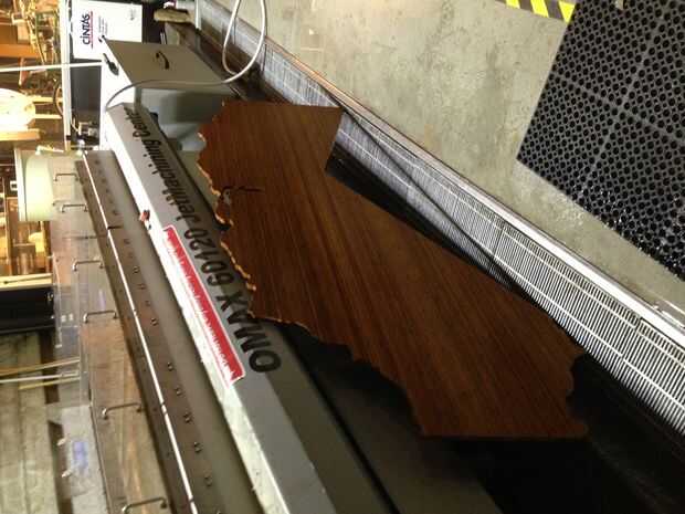 A continuación, yo configurar mi camino cortado en la disposición de Omax, exporta a Omax hace, afianzado con abrazadera plyboo a la cama del chorro de agua y cortar el escritorio.