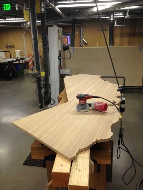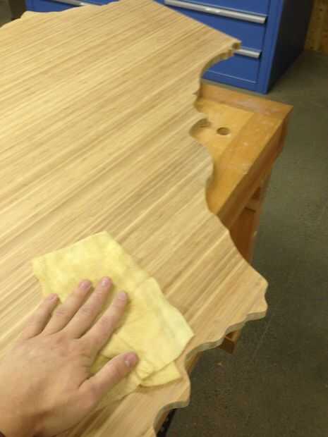 Usé una lijadora orbital para la arena de la parte superior e inferior de la California. Comenzó a 220 y me fui hasta 1000 discos de grano de arena. Redondeado los bordes con la lijadora orbital así. Y mano lija la geometría interna apretada.