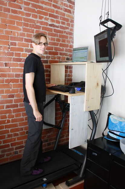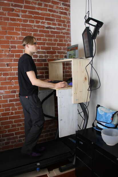 Si no se puede conectar algo a una pared, recomendaría un escritorio que se sienta en el suelo y forma un arco sobre la cinta.