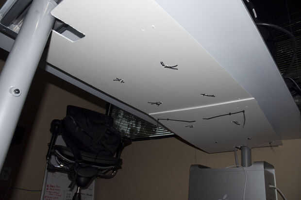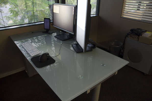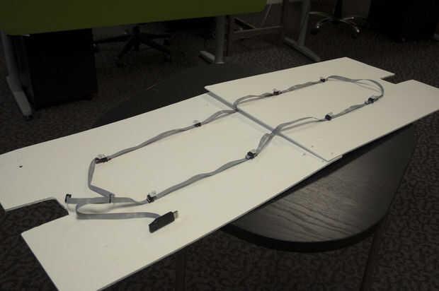 * Atado el núcleo de espuma (lado de luces para arriba) a la parte inferior de la mesa mediante abrazaderas de plástico alrededor de los soportes de metal