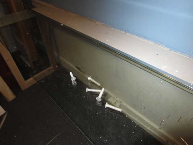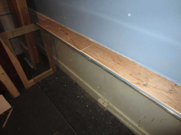 Para estabilidad adicional, os adjunto la tabla a los travesaños con tornillos avellanados 1-1/4". Además, taladré agujeros para acomodar los pernos para la chapa. Los pernos de sentarse delante, pero no pasan por) la cruza. Así si encuentro una tira más larga de la madera contrachapada chapeada, será una simple cuestión de cambiar éste.
