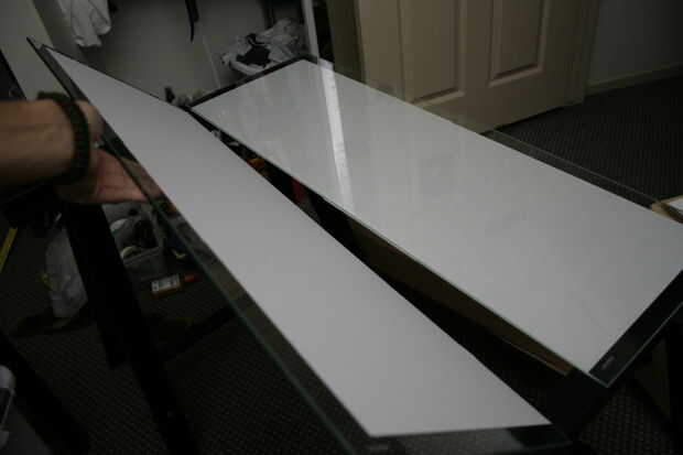 PT. 2. Pegar las etiquetas a un lado del cristal. Te recomiendo limpiar los vidrios con windex u otros limpiacristales doméstico para deshacerse de la grasa y suciedad. Puse 4 hojas en cada panel. Las imágenes pueden ayudar a ilustrar. Realizar siempre a partir de una esquina o el centro y su manera alrededor de ese punto para minimizar las burbujas de aire. Voltear los paneles cuando termines