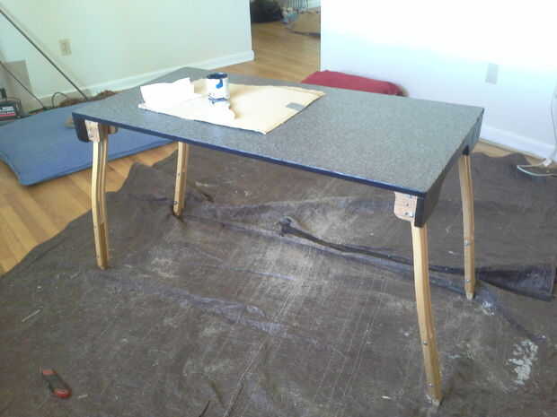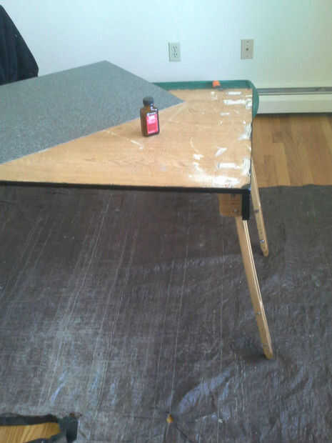 Cubra toda la superficie de tu escritorio con cemento de contacto. Hacerlo en un lugar bien ventilado ya que el contacto de cemento realmente olores. Iniciar en los bordes de su escritorio, en caso de que se ejecuta bajo en cemento. Algo que le falta pegamento en el centro en alguna parte que en un borde. La botella que ves en la foto sólo cubrían la superficie. Evité comprar una botella más grande debido al costo del cemento.